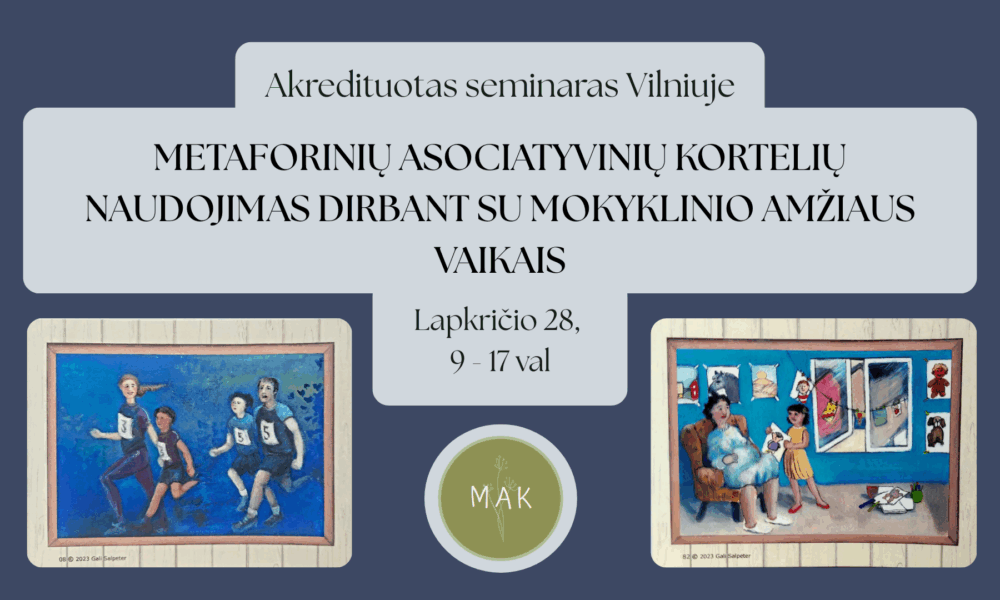 KVIEČIAME JUS Į AKREDITUOTĄ PATYRIMINĮ SEMINARĄ VILNIUJE „METAFORINIŲ ASOCIATYVINIŲ KORTELIŲ NAUDOJIMAS DIRBANT SU MOKYKLINIO AMŽIAUS VAIKAIS“! (8 val.)! Kas yra metaforinės asociatyvinės kortelės (MAK)?…