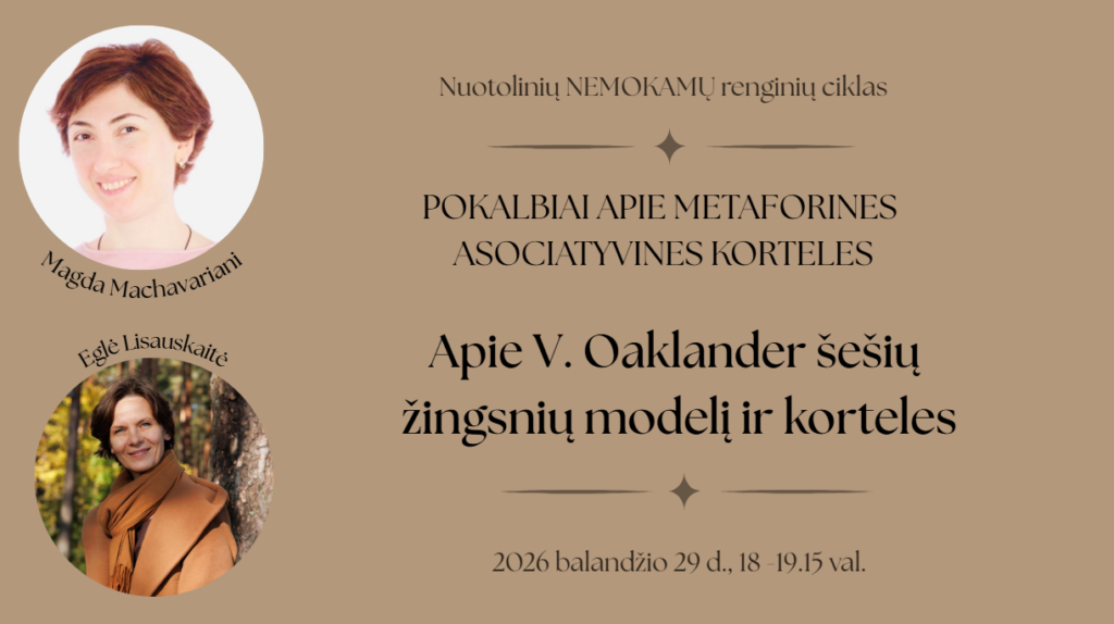 - Plačiau papasakosime apie nuotolinį seminarą “Metaforinių asociatyvinių kortelių panaudojimas dirbant su vaikais ir paaugliais. V. Oaklander geštalto požiūris”, kuris vyks gegužės 24-ąją.